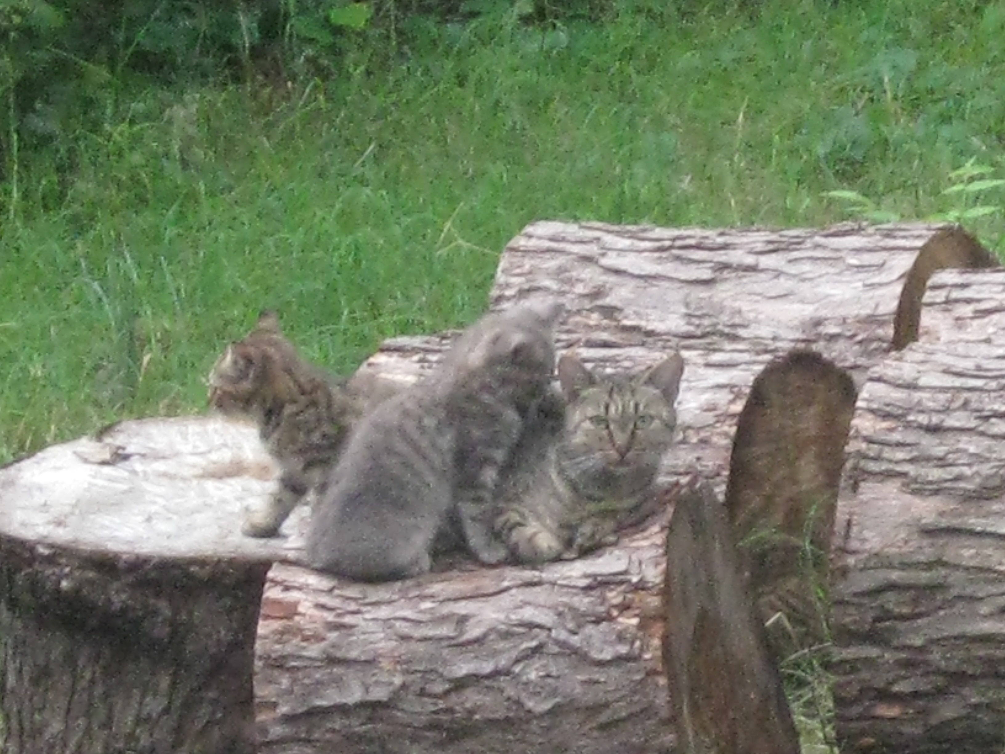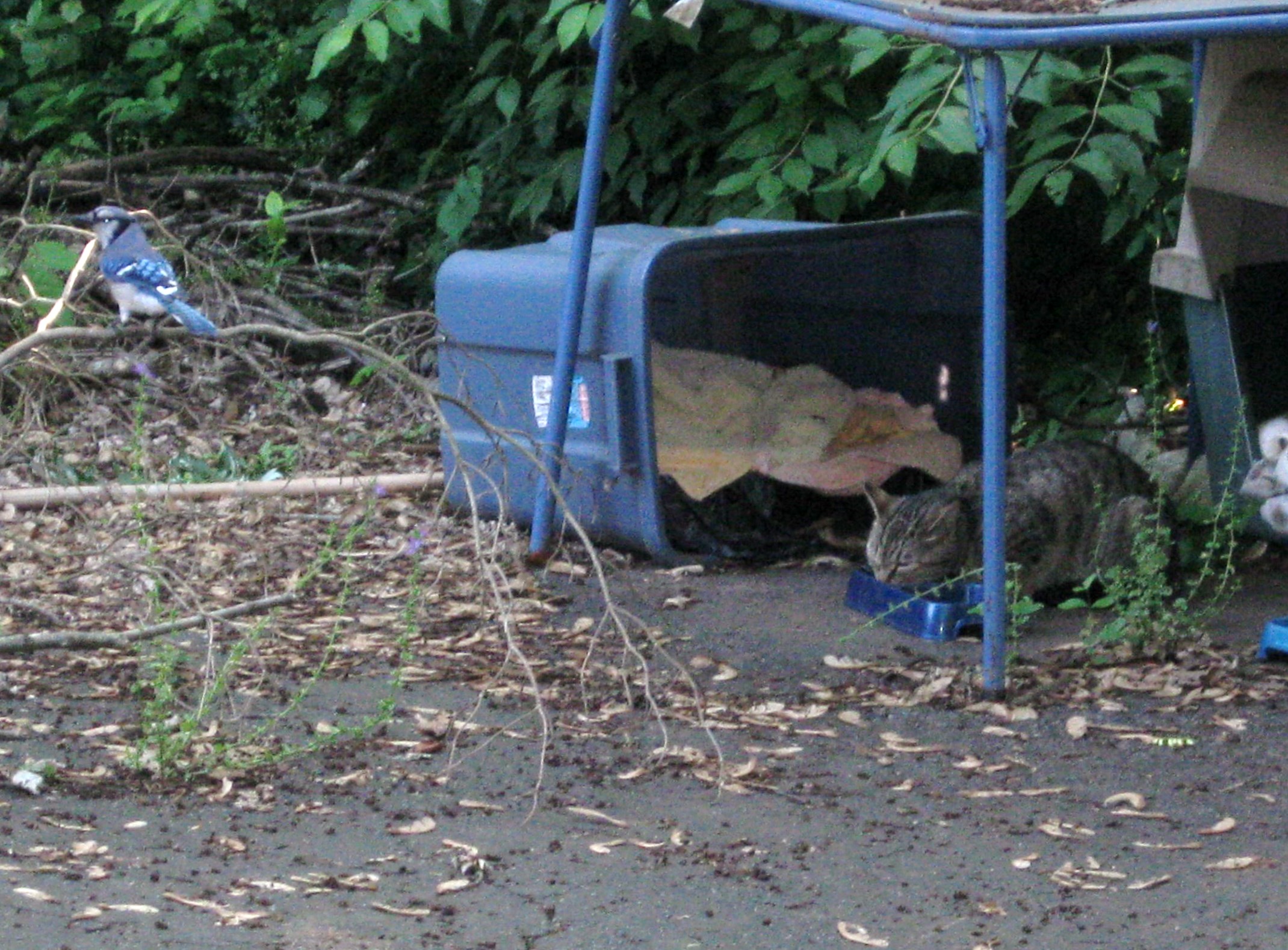 He froze and eyed me. As soon as I got my wits, I froze too. I slowly back away, and then he made his move, retreating under the table and then off the patio. He had his head cocked toward me, and we stood still, watching each other. The other cats returned to the table to eat. I jokingly fussed at them for not alerting me to the visitor, who startled me to say the least.